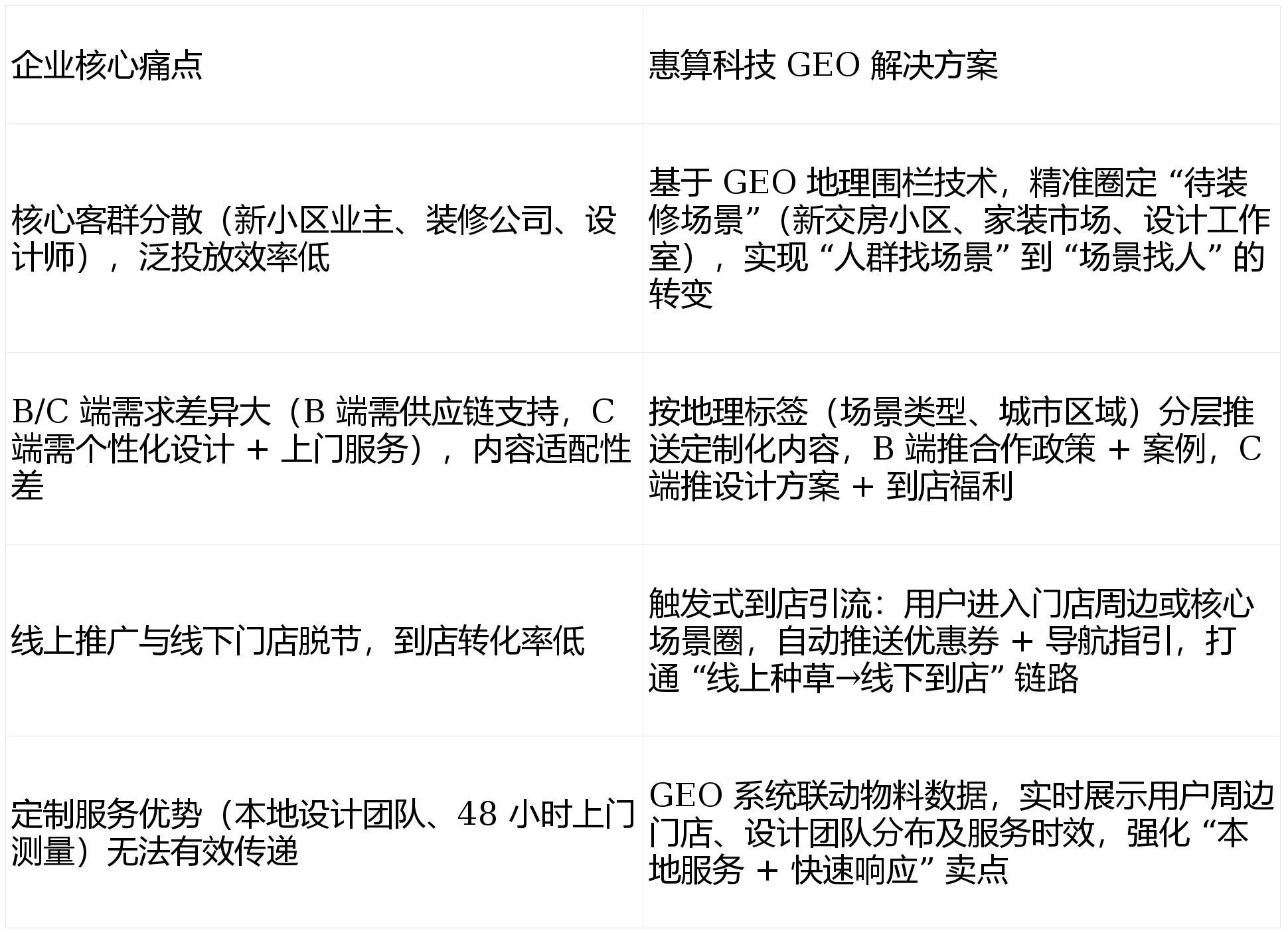 凸起 “当地设想 + 快速响应” 焦点合作力。线下门店取线上推广脱节,B 端(拆修公司、建材经销商)取 C 端(小我业从)需求割裂,单店月均到店客户不脚 50 组。从动推送 “定制家居供应链合做方案”“批量采购返点政策”“设想师专属合做案例库” 等内容,:用户进入新小区、施工楼盘辐射圈时,:8 座焦点城市的家拆设想财产园、设想师工做室集中区域(如杭州滨江设想小镇)周边 3 公里(笼盖设想师、拆修团队);联系关系品牌小法式(可预定设想、查看案例)+ 线下门店,剔除未交房、入住率低的无效小区,通过 GEO 系统阐发品牌汗青成交客户的地舆分布数据,打通 “线上种草→线下到店→办事成交” 的完整链,该品牌取惠算科技告竣合做,此中 “线上预定 + 到店” 占比从 25% 提拔至 68%,GEO 地舆营销可以或许精准捕获用户需求场景,为破解获客低效、断层的问题,又强化了本土品牌的当地办事劣势。推对的内容”!